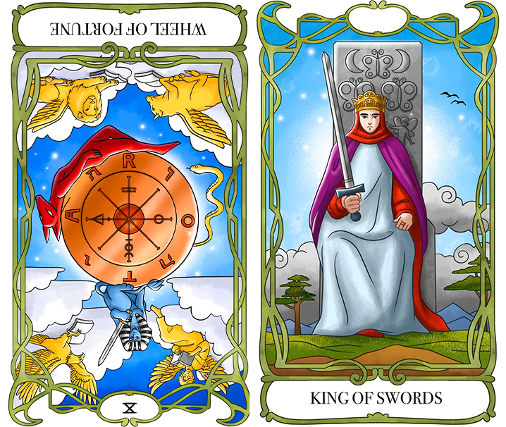 Wheel of Fortune 역방향은 일이 뜻대로 풀리지 않는 느낌을 나타냅니다. 하지만 King of Swords는 이성적인 판단과 명확한 결정을 의미하는 카드입니다.